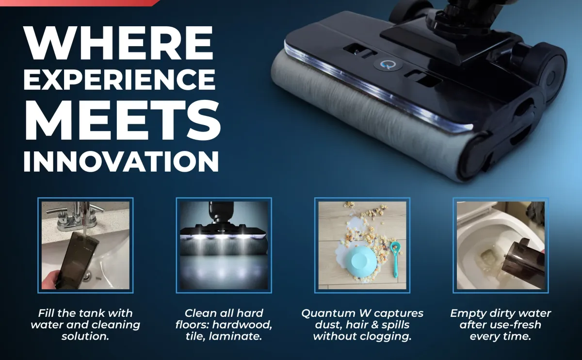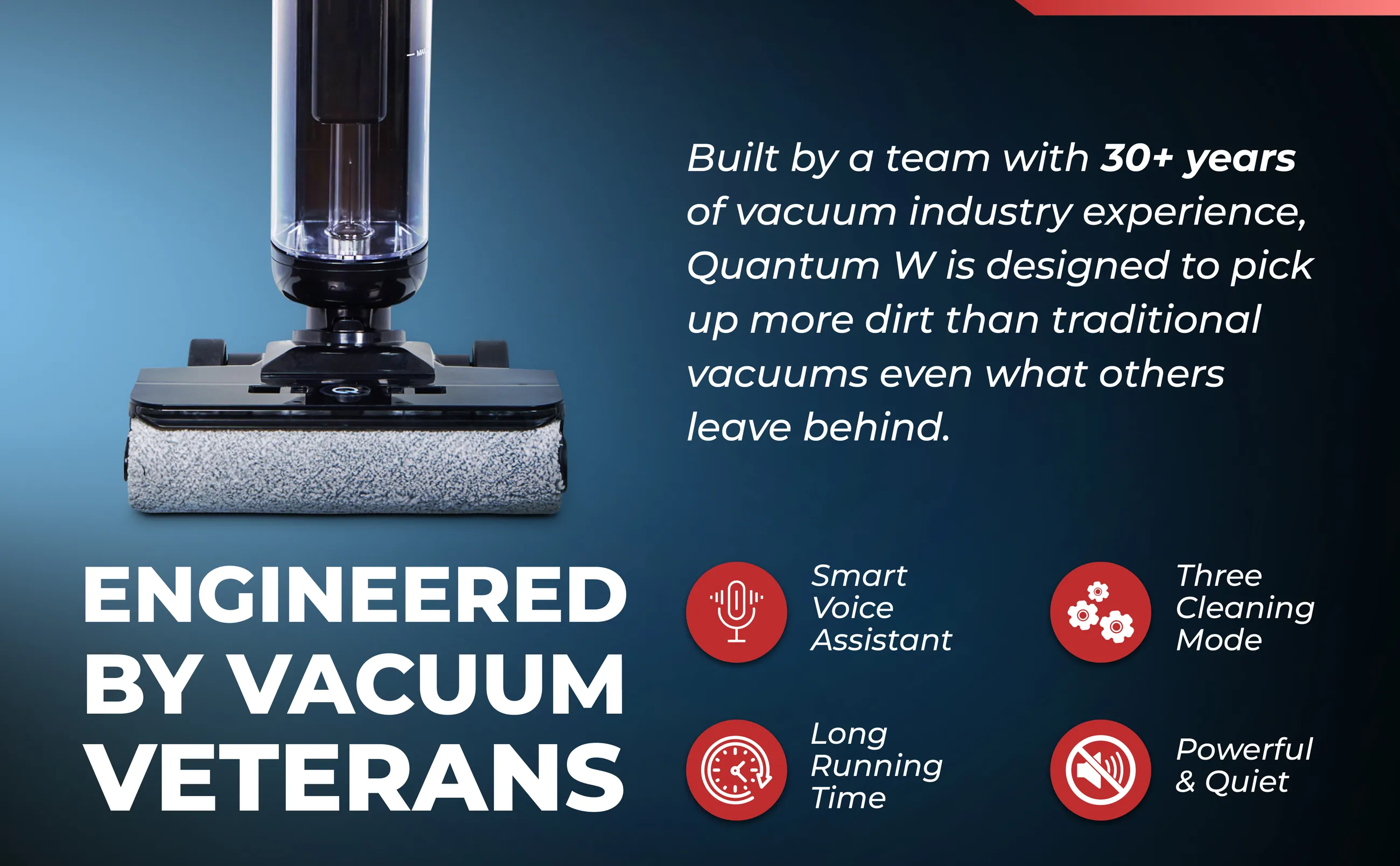 This isn’t just another vac. The Quantum W is the all-in-one wet/dry cordless powerhouse designed to tackle messes like never before. Pet hair, spills, crumbs, or deep floor grime — it handles it all in one pass with the cleaning performance you expect from Quantum.